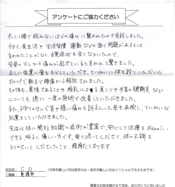「毎朝くる腰の痛み・だるさも解消されました」お悩み:腰痛による腰の痛み、下半身のだるさ、猫背(姿勢) 今まで仕事が忙しく、施術に通う機会がなく、全身、下半身のだるさ、特に腰のだるさがありました。 時間が出来たのでこちらでお世話になり、上半身のだるさは完全になくなり、腰も朝のだるさもほぼなくなりました。 来る前と来たときの身体の状態は雲泥の差で、姿勢も見てわかるぐらい良くなりました。 食生活などのアドバイスも聞いてみて損はないと思います!(西宮市 上枝様) ※ご本人様の了承を得て掲載させて頂いています。効果には個人差がございます。動画の内容を要約して記しています。詳しくは動画をご覧ください。 |